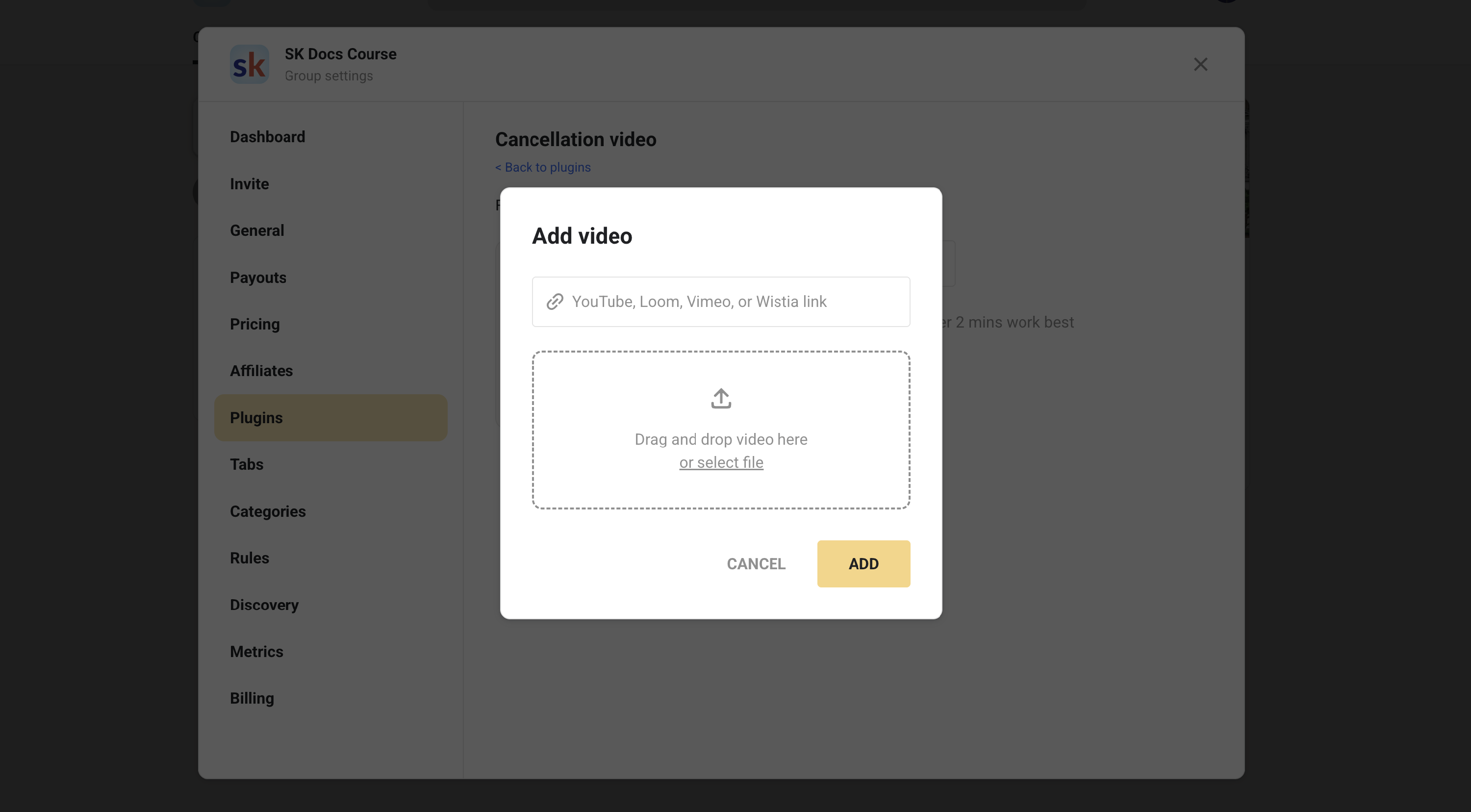 - Click on the Cancellation video. Add a video by uploading it to Skool or by embedding the link to the video.
