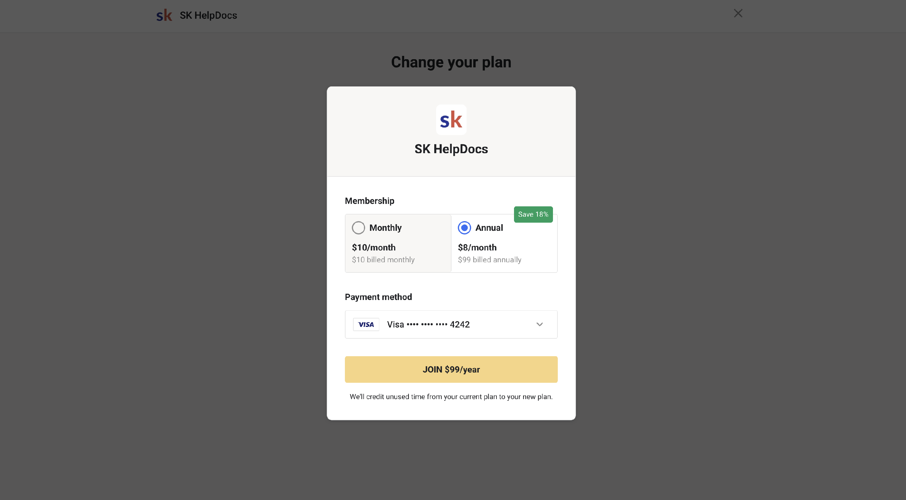 Note: When a member upgrades from monthly to annual, they pay the annual price minus their current month's payment. For example, if they have paid $10 per month and the annual plan is $99, they'll pay $89 to upgrade. It's a prorated upgrade pricing.