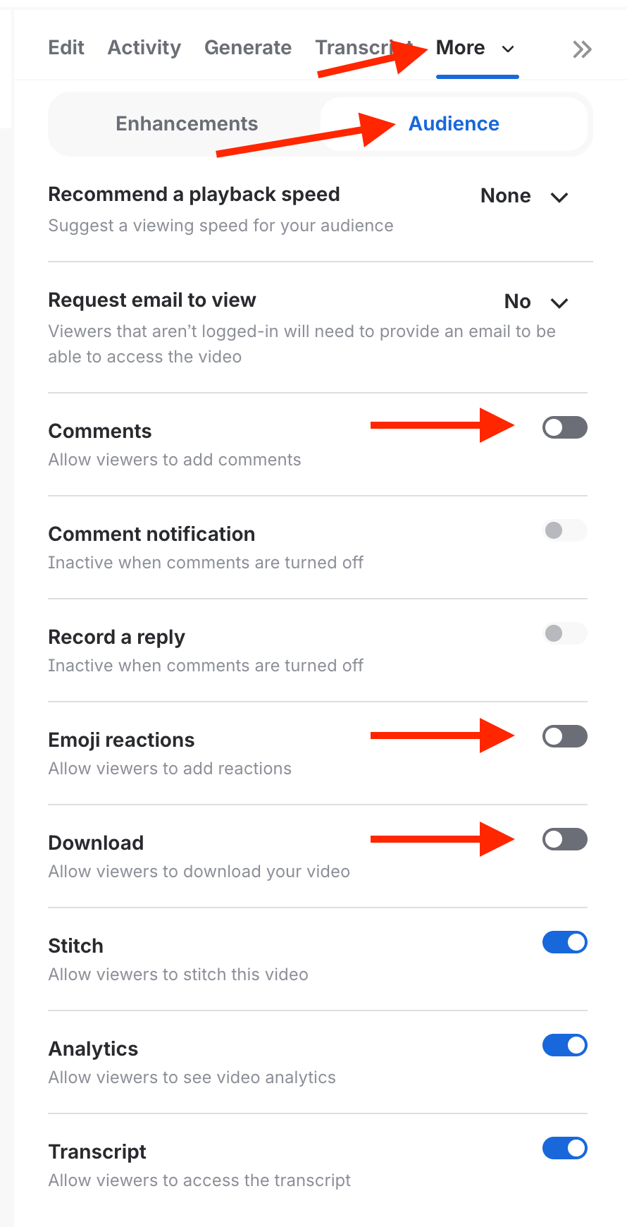 - We recommend toggling off further settings for your videos since they may affect the stream for members on various devices. Navigate to More > Settings > Audience and toggle off comments and emoji reactions.