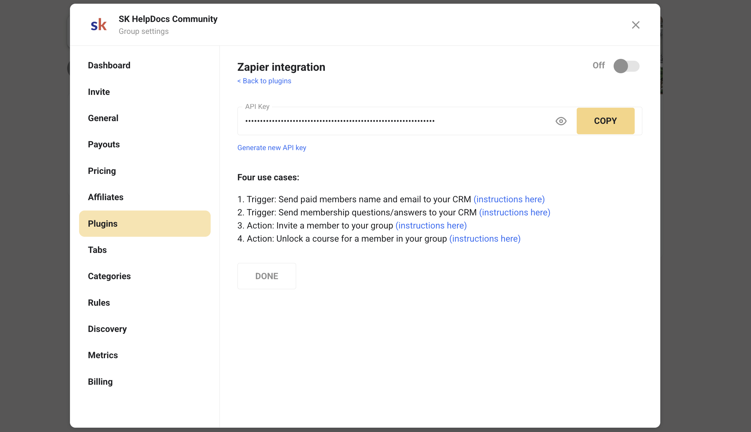 Here you will see the ability to toggle Zapier on/off, your API key (required to link your Skool group to your Zapier account), a button to refresh your API key and some basic setup instructions as the rest of your control exists on the Zapier side: