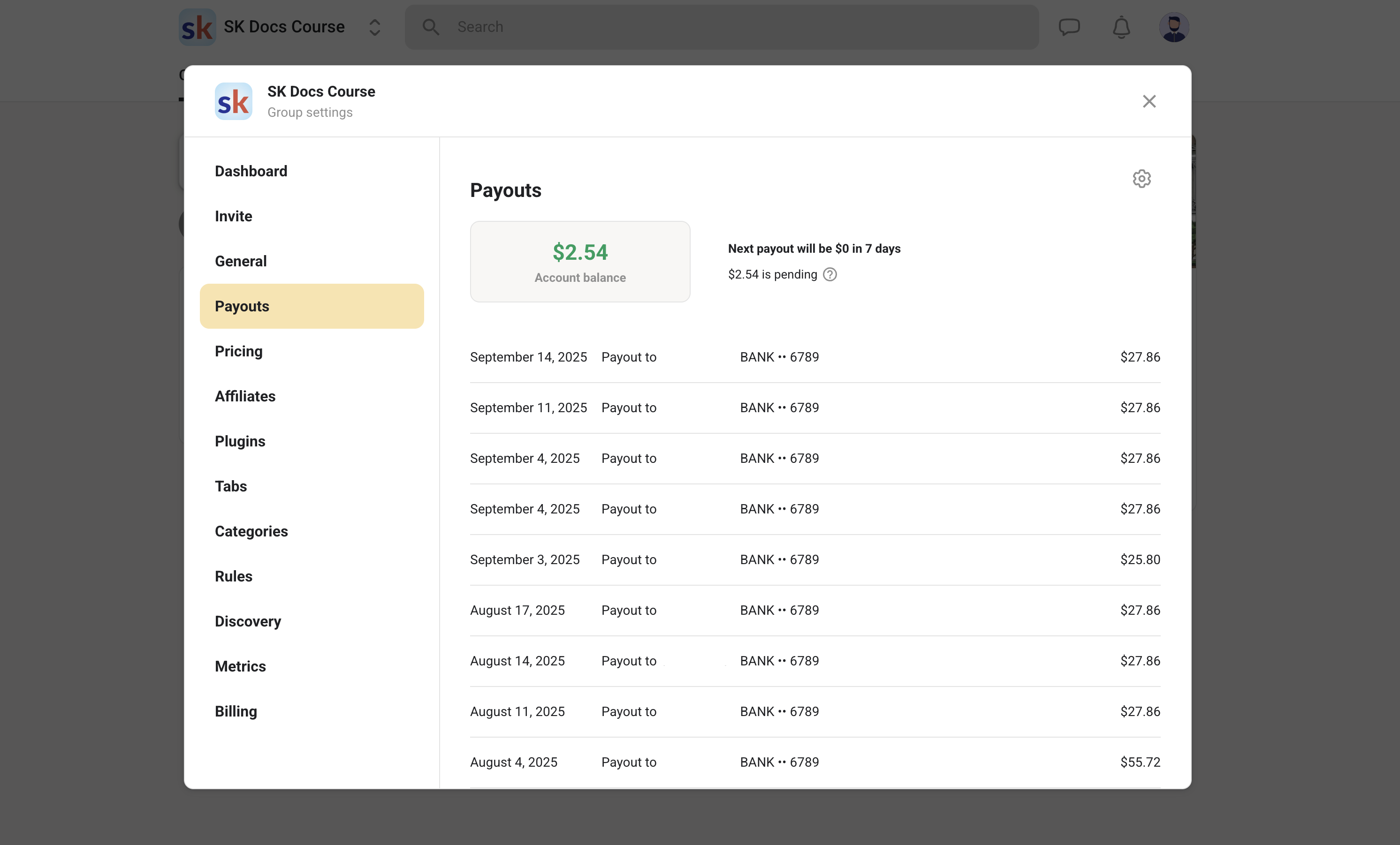 Whenever you make money by selling memberships or by course sales within your group, the funds are accumulated and are paid out to your bank account. Here's how to look at payout info: